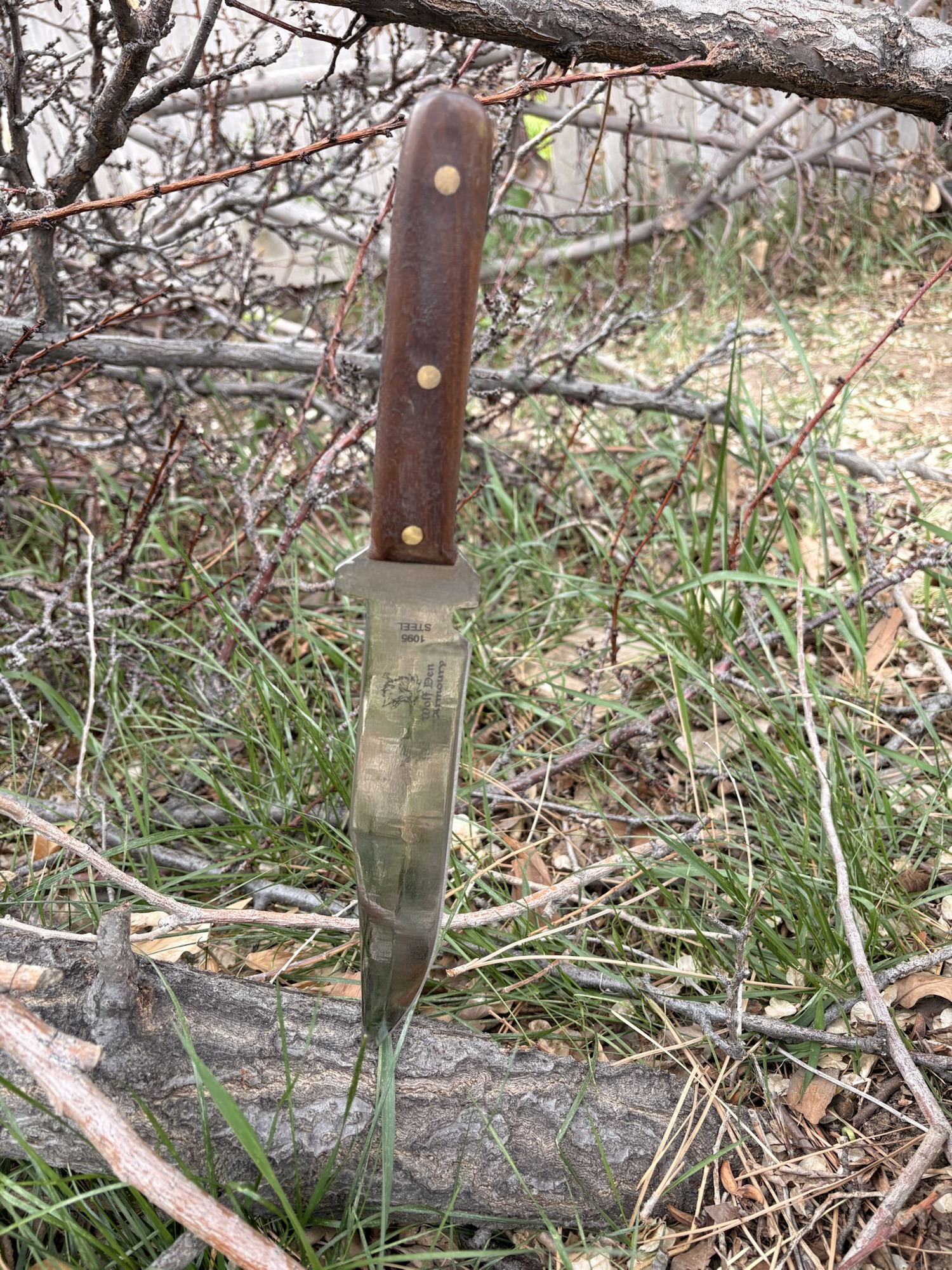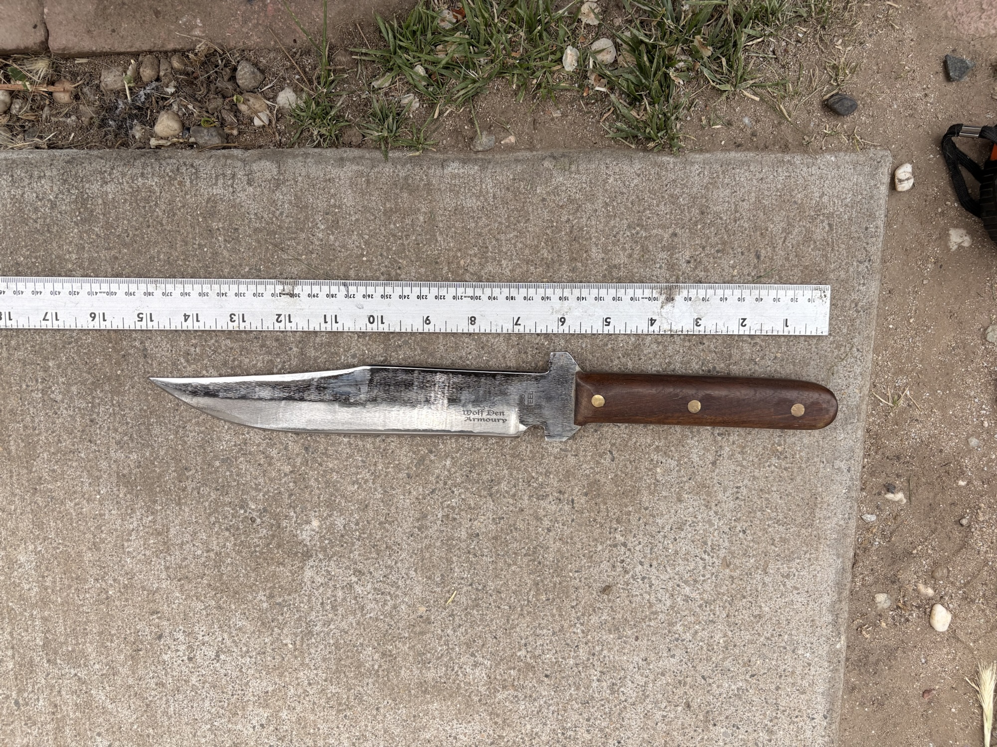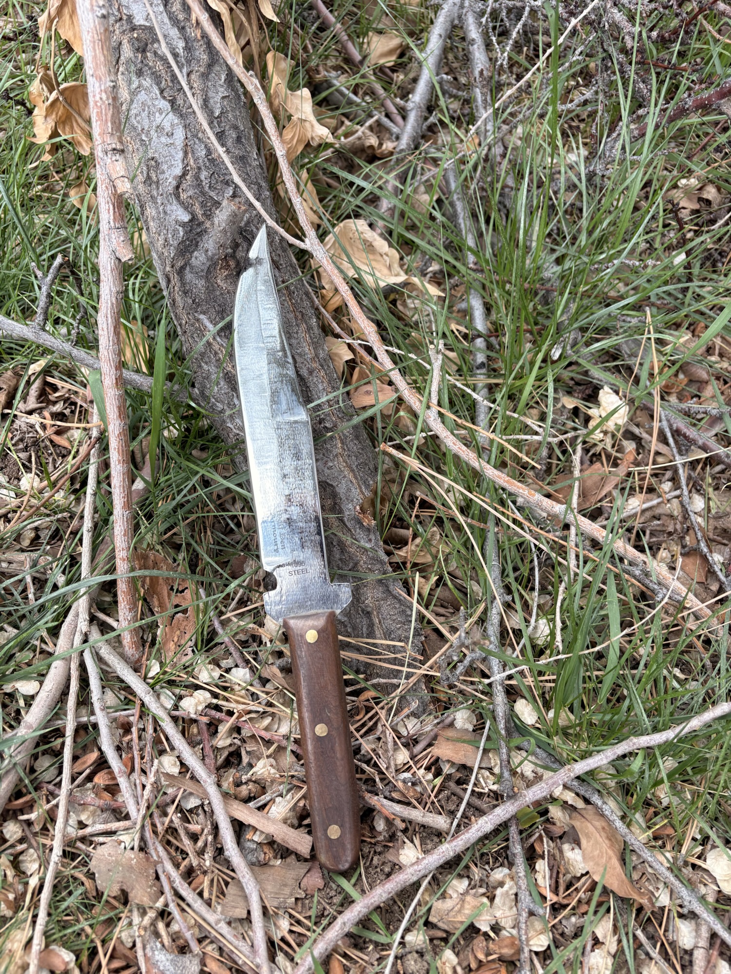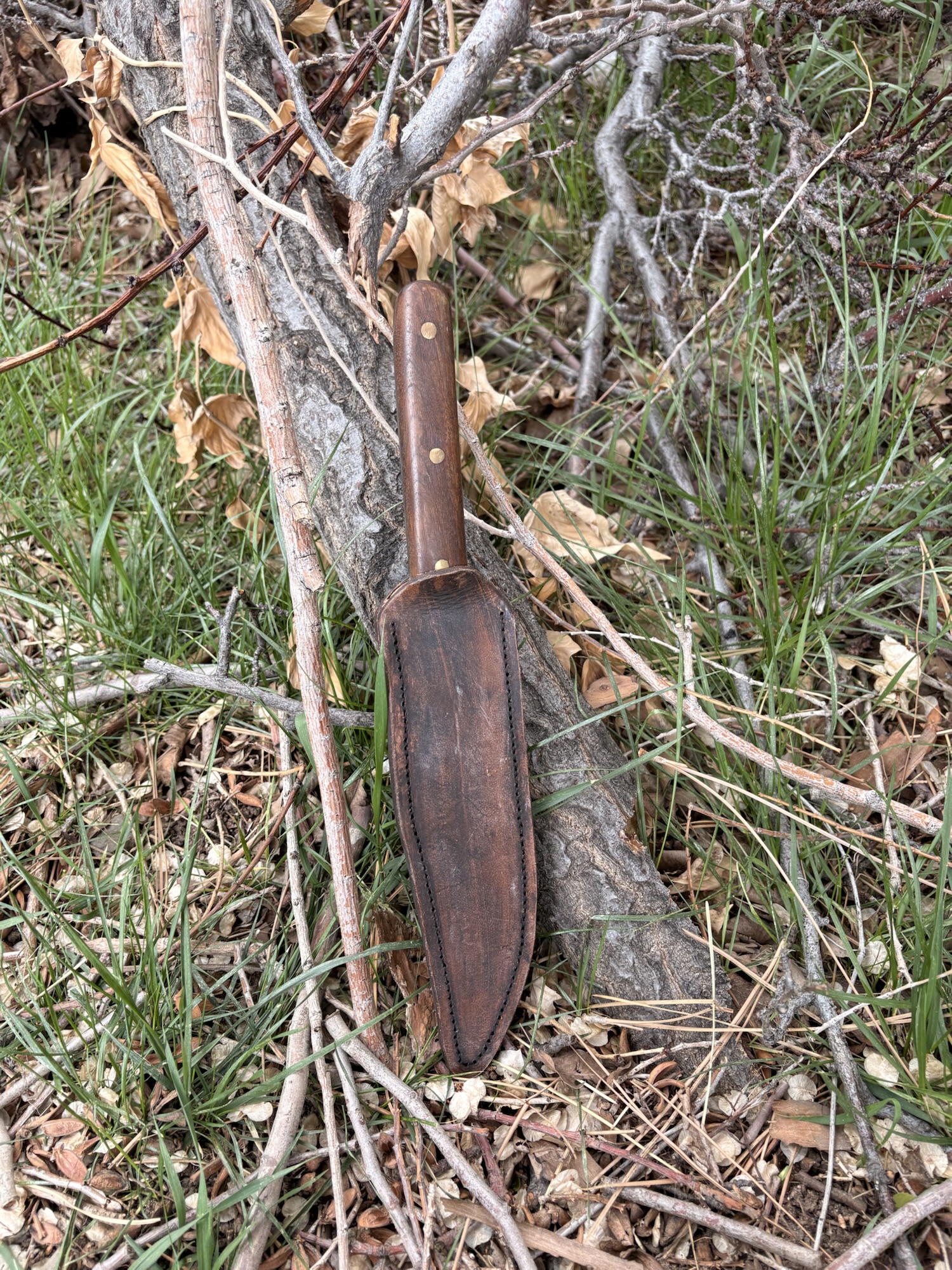 15″ bowie with a straight walnut handle scout carry leather sheath