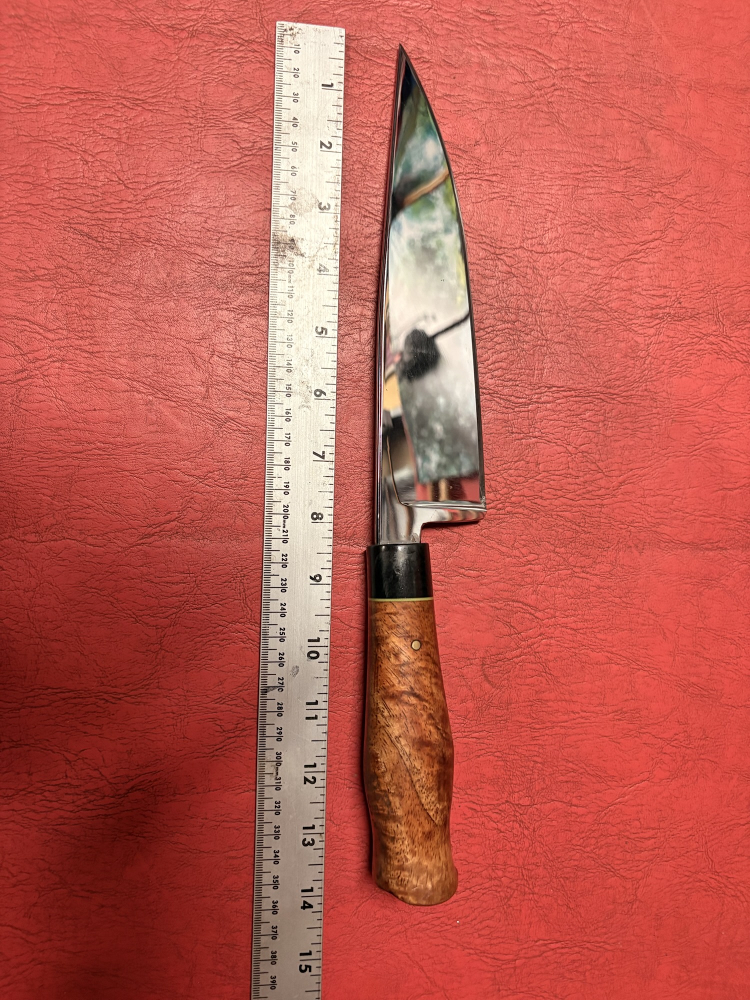 Chefs knife, Made from SUP-9 (5155) high carbon steel, handle is koa wood with African black wood bolster with a g10 spacer (comes with a zipper case)