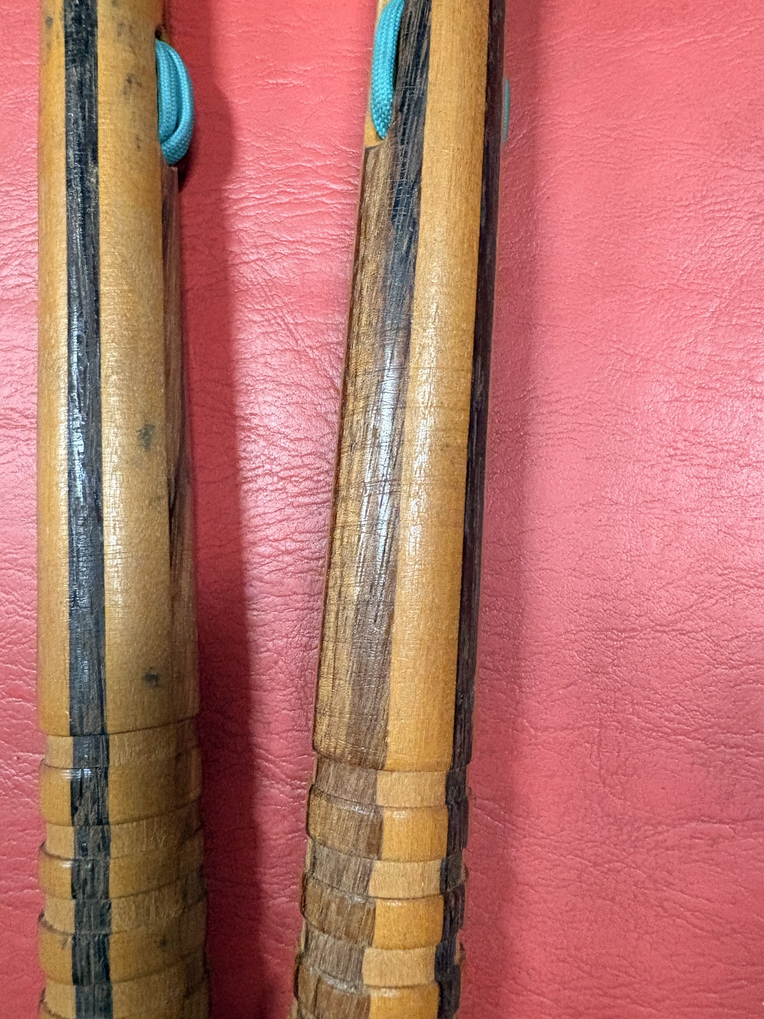 Laminated nunchucks made from yellow heart wood, zebra wood, and black palm