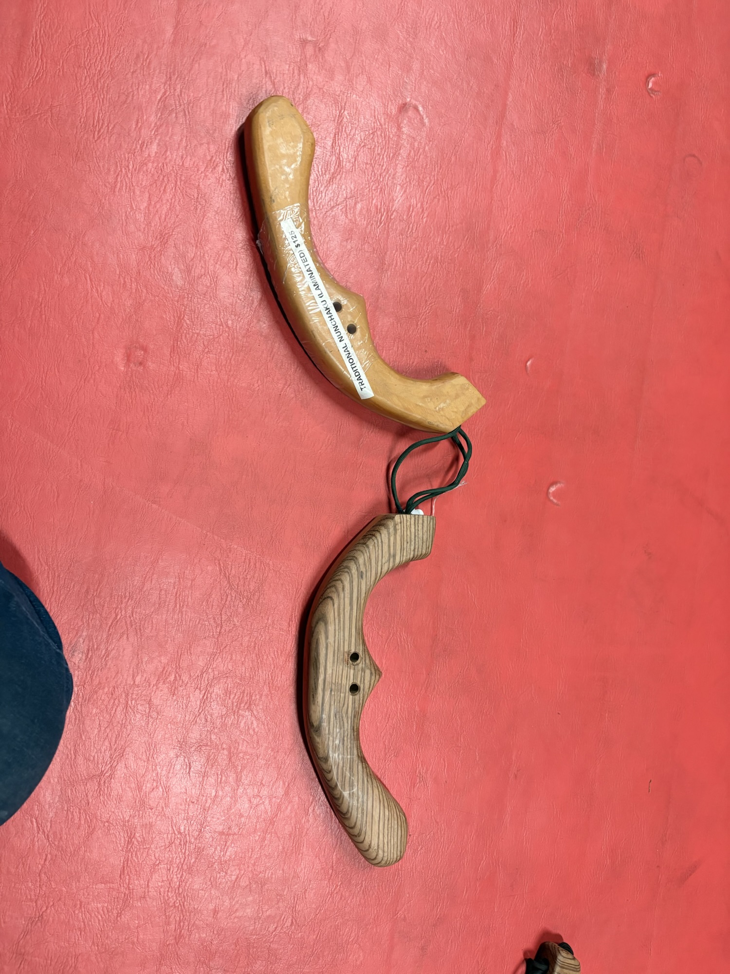 Nunchucks based of the supposed traditional shape made from laminated zebra wood and yellow heart wood