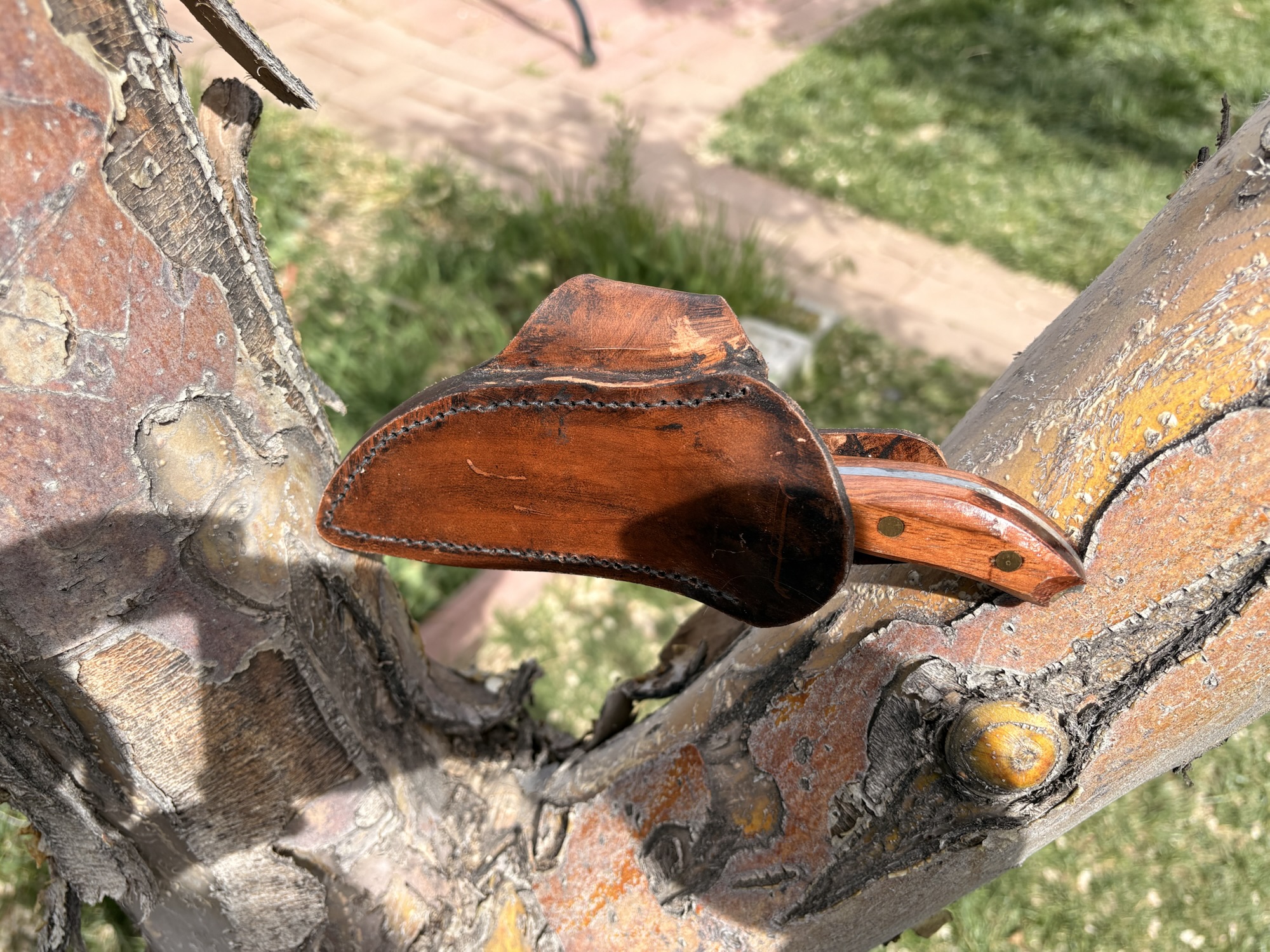 Recurve bladed knife made from 80CRV2 steel and koa wood handle and scout carry sheath