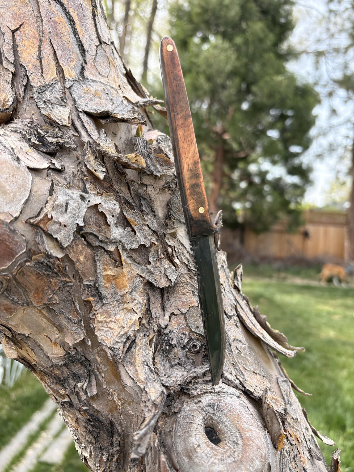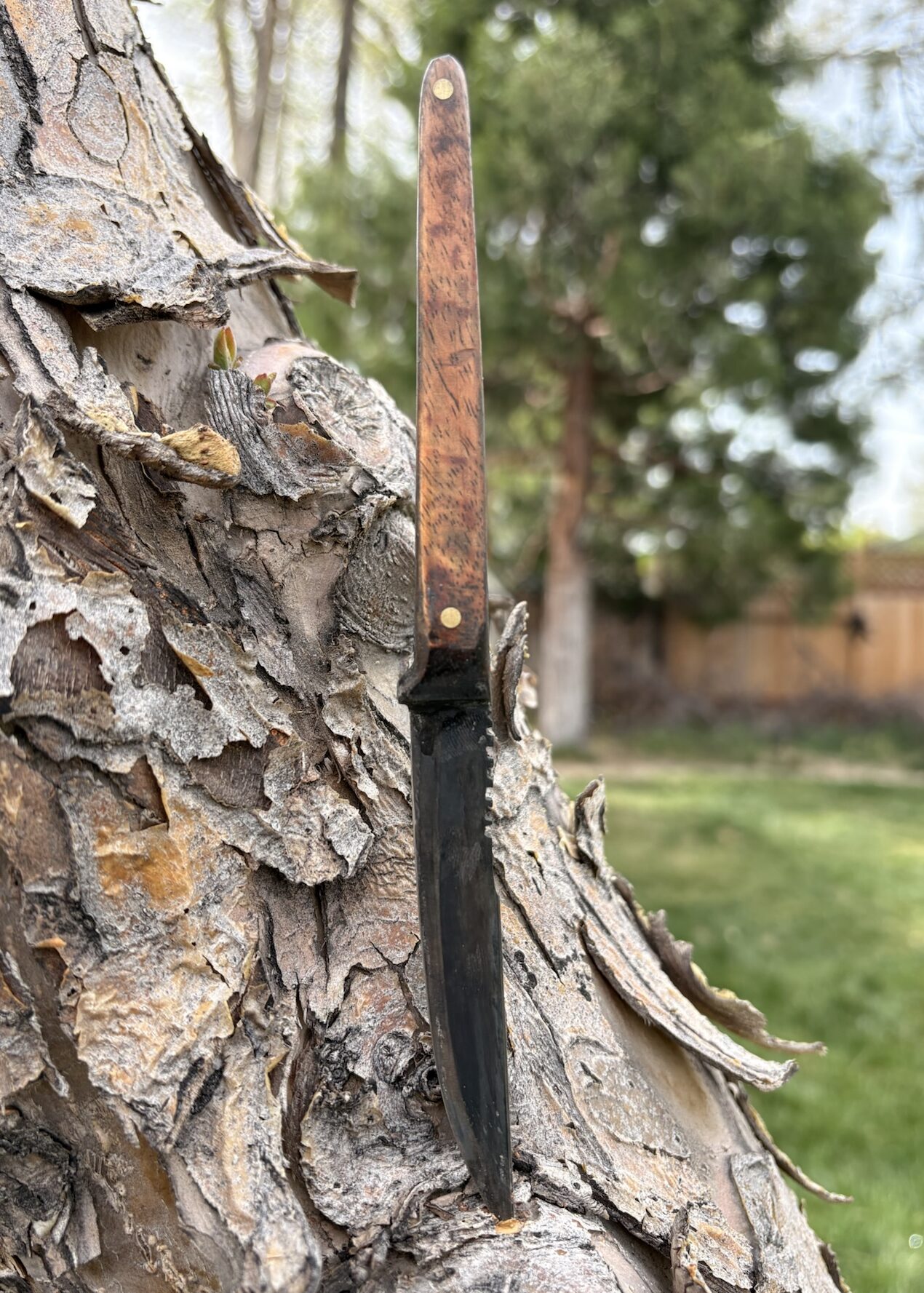 Ultra slim tanto style knife made from SUP 9 steel with koa wood handle and a kydex sheath.